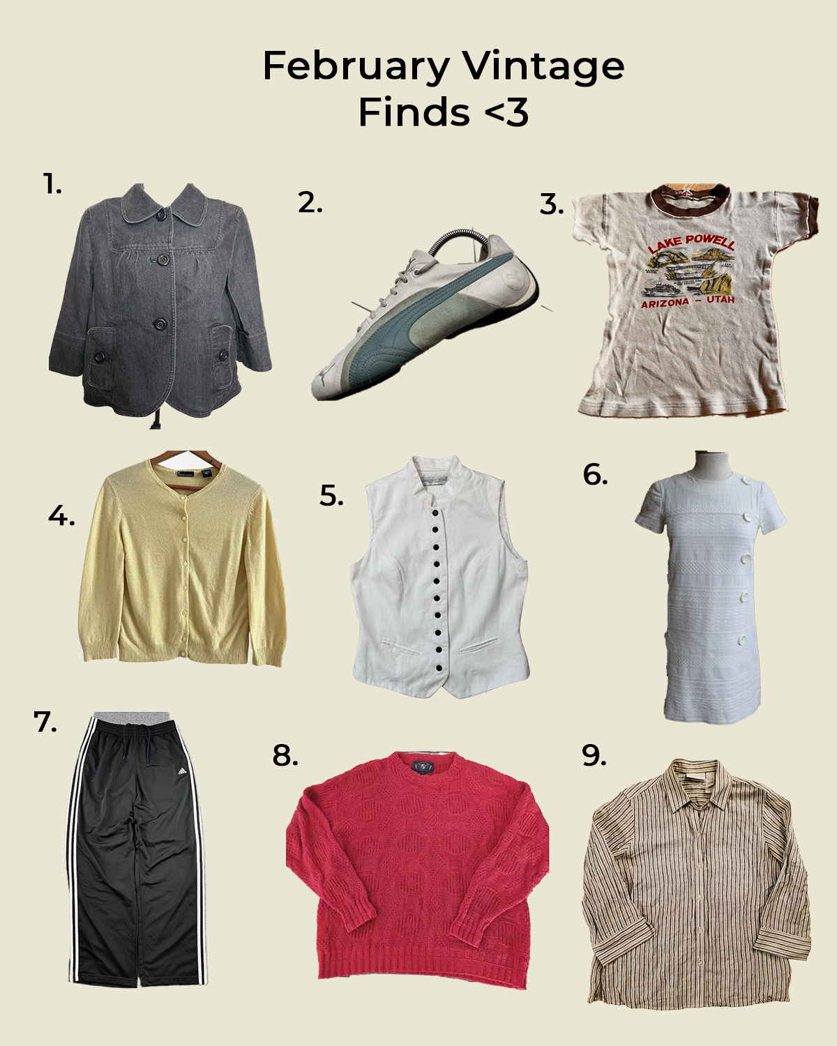 - Button Up Jacket 2. Vintage Puma's 3. Lake Powell Ringer Tee 4. Butter yellow cardigan 5. Button Up Tank 6. 60's dress 7. Adidas Track Pants 8. Red Sweater 9. Striped Button Down
